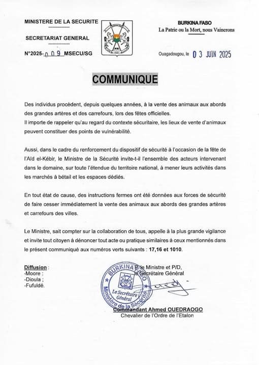 Le ministre de la Sécurité appelle donc tous les acteurs du secteur à exercer leurs activités exclusivement dans les marchés à bétail et les espaces dûment autorisés.