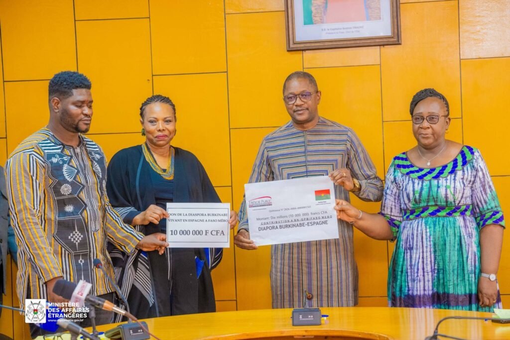Le montant total versé se répartit équitablement entre le Fonds de soutien patriotique (10 millions FCFA) et l’Agence Faso Mêbo (10 millions FCFA). Selon Madame Karidia Friggit/Konaté, Consul Honoraire du Burkina Faso à Madrid et cheffe de la délégation, ce geste reflète « l’amour que cette communauté porte à la mère patrie et sa volonté de contribuer à la restauration de l’intégrité territoriale et au développement du pays ».