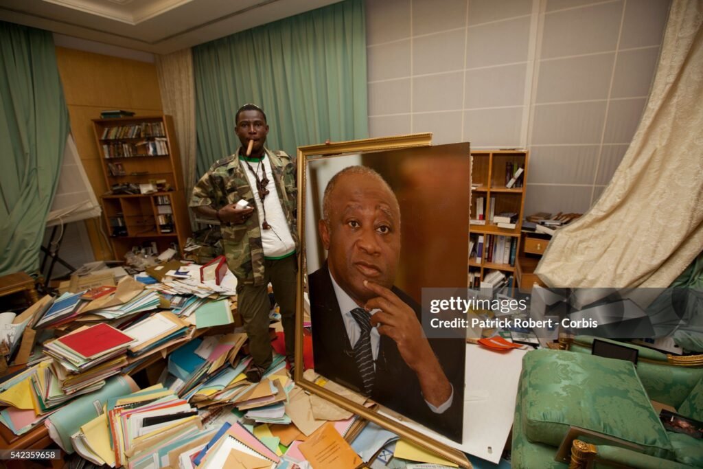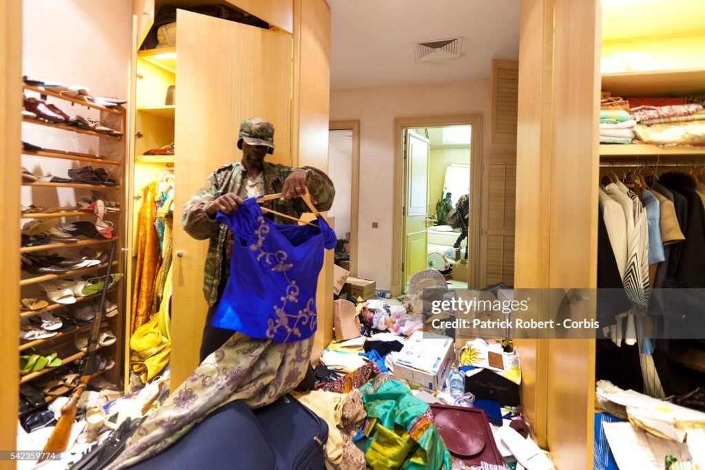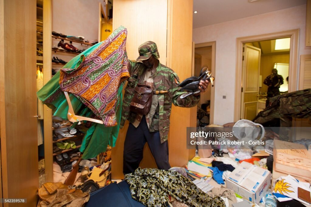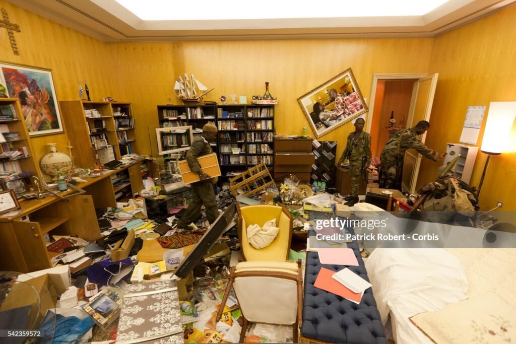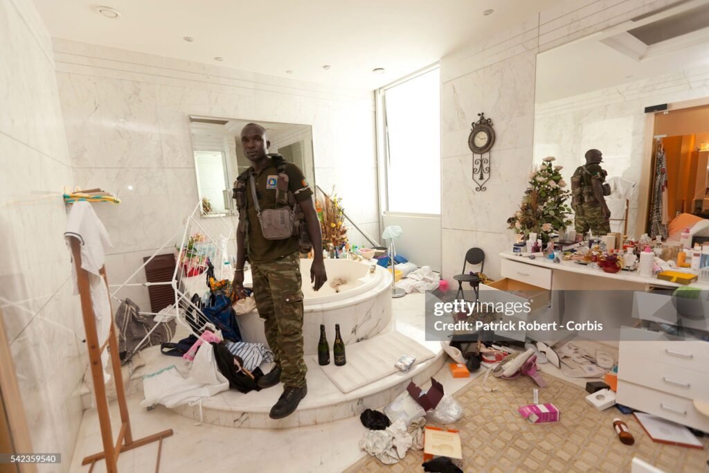Republican Forces loyal to elected President Alassane Ouattara loot the residence of Laurent Gbagbo arrested earlier on April 11. A fighter displays in front of the French soldiers a sabre in gold offered by an Emir and taken inside of the bedroom of Laurent Gbagbo (Photo by Patrick ROBERT/Corbis via Getty Images)