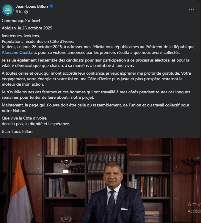 Abidjan, 26 octobre 2025 – Dans un communiqué publié au lendemain de la présidentielle, Jean-Louis Billon, candidat du Congrès démocratique (CODE), a reconnu sa défaite et félicité Alassane Ouattara, président sortant, arrivé largement en tête selon les résultats provisoires de la Commission électorale indépendante (CEI).